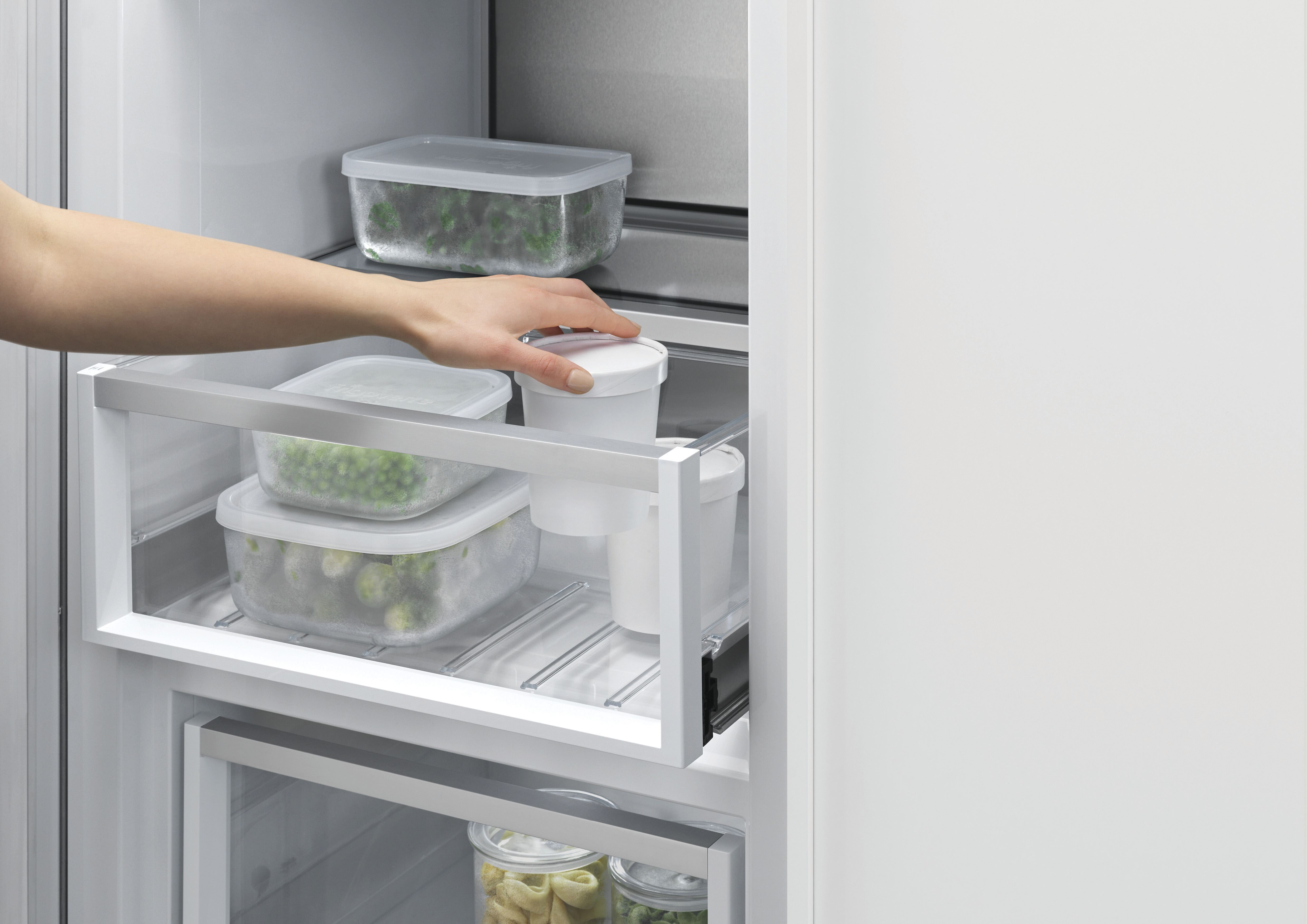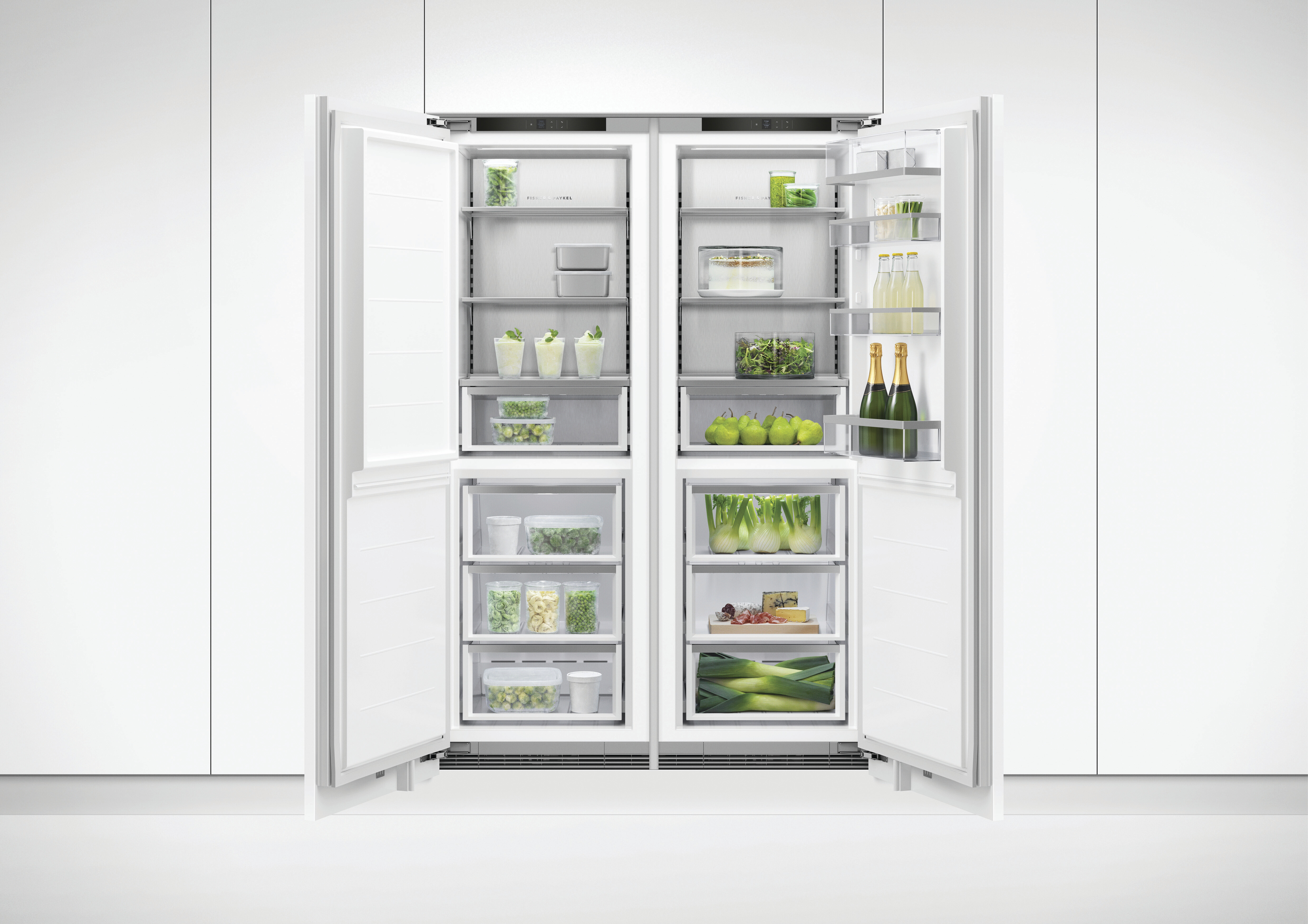 僅 4 毫米的極窄縫隙完美嵌入廚櫃,從正面看不見任何機械結構。您可以將它完全隱藏在櫥櫃門板後,讓冰箱「消失」;或搭配我們專屬的不鏽鋼面板,打造俐落現代的風格。美觀,從看不見開始。